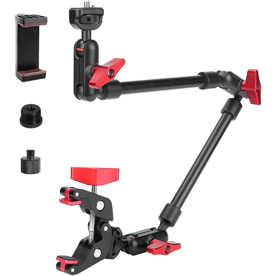 Some of our favorite mounting gear and accessories. Most of these are used to mount cameras, mics, or lights to a desktop based setup. We’ve included a photo reference of the optimal way to mount your product camera for a desktop based streaming setup. Also included are some optional cable management and power solutions for your desk, as well as the Elgato Stream Deck for custom OBS control.