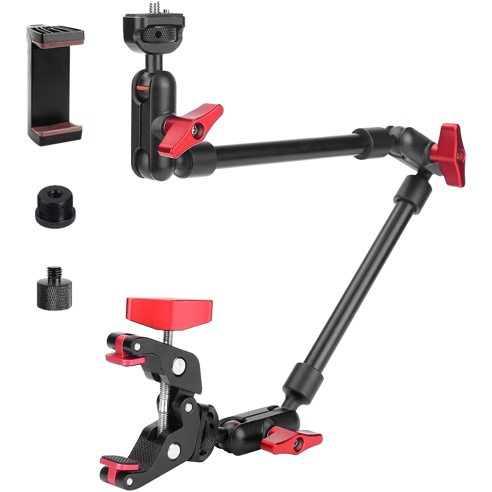 Some of our favorite mounting gear and accessories. Most of these are used to mount cameras, mics, or lights to a desktop based setup. We’ve included a photo reference of the optimal way to mount your product camera for a desktop based streaming setup. Also included are some optional cable management and power solutions for your desk, as well as the Elgato Stream Deck for custom OBS control.